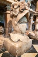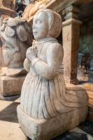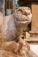 A curious lion at his feet. Unlikely the carver had ever seen a lion.