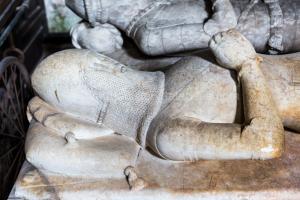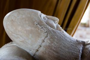 Around 1375. St Mary the Virgin Church, Newton Solney. Effigy of unknown member of the Solney family. Goat belt buckle. Camail and Jupon Period.