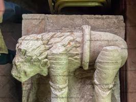 After 1446. St Bartholemew's Church, Tong. Monument to Fulk de Pembridge of Tong Castle and Isabel de Lingen. She the foundress of the church. Camail and Jupon Period. His head rests on a Great Helm with his crest of a Turkish Woman with plaited hair. At his feet a lion, at her feet a fawn albeit no longer with its head. She in widow's clothes with a barbe. Note the curious chain attached to the bottom of her dress.