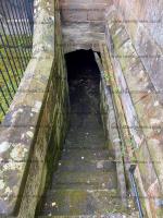 After 10th August 1358. Monument to Piers Grandison 2nd Baron Grandison. Lady Chapel of Hereford Cathedral. Mid 14th-century, altar-tomb with effigy and canopy, altar-tomb with range of cinquefoil-headed panels in front and panelled buttresses at ends carried up to the cornice of the canopy, effigy in mixed mail and plate-armour with camail and ridged bascinet, hauberk with scalloped lower edge, cyclas, enriched Hip Belt with dagger hanging in front and sword at side, head on cushions and feet on hound; recess with panelled back, moulded jambs and square head enriched with Paterae and trefoiled and sub-cusped pendant tracery below the head; vaulted soffit to canopy; canopy with range of six bays of open arcading with trefoiled and sub-cusped heads, crockets and finials, in arcading two headless figures of the Coronation of the Virgin, headless figure with book, archbishop with cross-staff, St. John the Baptist holding a roundel with the Agnus Dei, and a bishop, last four figures brought from elsewhere; canopy finished with enriched cornice and pierced parapet with quatrefoils and cusped cresting.