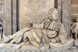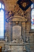 Monument including a white marble figure elbow reclining on a deep chest in front of a lengthy inscription and under an arch crowned with armorial bearings. Large sub-figures flank the chest and the armorial bearings. Earl's coronet. Signed by William Stanton (age 60). Powdered Wig. Heeled Shoes. Buckled Shoes.