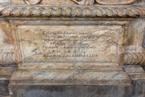 "Elizabeth comitissa eius dotaria e nobili Grahamorum familia prognatta Richardi filii Ricardi Graham de Com. Norff. Armi. pro rege Carolo Primo strenue dimicantis capitanei, filia; Hoc amoris sinceri, summæ observantiæ gratio demun animi pignus, pro tenerrimo dni et mariti erga se affectu nulla licet beata prole, moestissima posuit; et post obitum corpus suum cum dilectissimo marito hic recondi voluit."