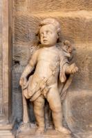 Monument Elizabethan Period. Tall Sideboard Tomb with reclining hooded figure of Lady Katherine, daughter of Peregrine, with Chrisom Child in the crib at her feet. Above a standing figure of Peregrine Bertie 13th Baron Willoughby in a niche, with strapwork embellishments, all supported on composite columns with a dentilated cornice. Possibly the work of Samuel Baldwin.