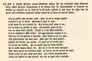 Effigy of Edward, the Black Prince. The Prince's Tomb is not in the Lady Chapel, as ordered in the Will, but on the south side of the Chapel of the Holy Trinity. In other respects it nearly agrees with the above order. The Tomb is of Sussex marble, divided into sixteen quatrefoiled panels, six on each side, two at the head, and two at the foot of the Tomb, in each of which are fixed escutcheons of copper, enamelled alternately with the arms and badges of the Black Prince. Above those, with the arms, is engraved on scrolls of copper, HOUMONT; and above those, with the badges in a similar manner, ICH DIENE. The effigy is of copper gilt, and lies upon the Tomb on a table of the same metal: it represents the Black Prince in armour, his head resting on his helmet, on which is the chapeau surmounted by a leopard crowned, having a file of three points about his neck. The countenance of the Prince possesses fine character. He is represented with long mustachios, which fall on each side over the camail, with which his face is closely enveloped; his beard is almost entirely concealed. On the bacinet is a rich coronet, the circle of which was once set with stones or glass. The manner of attaching the camail to the bacinet by the vervelles, or staples, with a silken lace, is here very clearly explaineda. The plates are very evident beneath the coat armour, which is emblazoned in relief with the arms of England and France quarterly, over all a file of three points. The gauntlets are armed with bosses or broches on the middle joints of the fingersb. The girdle is ornamented with gilt leopards' heads within circles, on a blue enamelled ground; in the centre within a quatrefoil, a leopard similarly enamelled. The sword is of the most beautiful workmanship. The pommel is ornamented with a leopard's head enamelled as the circles in the girdle. The hilt is of wirework. The sheath is richly wrought, engraved, and enamelled; its whole length is set with lapis lazuli in lozenges. The dagger is wanting. The solerets are of a preposterous length. It is uncertain what animal is intended at the feet. Considering how beautifully the whole of this figure is finished, it is singular that the armour is represented without either buckles, straps, or hinges. About the table of the Tomb are the inscriptions, engraved on plates of copper; the first is at the head of the Tomb, and the second commences on the south side and finishes on the north.