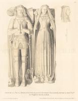 Effigy of John de la Pole, Duke of Suffolk, and his Duchess Elizabeth. JOHN was the son and heir of that unpopular minister, William de la Pole, Duke of Suffolk, who being banished for his political delinquencies, was put to death on the 2d May, 1450, at sea, off Dover, by the master of a Bristol shipa. His mother was Alice, daughter of Sir Thomas Chaucer, son of the poet of that name, the force of whose extraordinary genius has secured immortality for his works in spite of their obsolete language. He married Elizabeth, second daughter of Richard Duke of York, by whom he had five sons and four daughters; on account of which alliance his brother-in-law King Edward, in 1469, restored to him the dignity forfeited by his father's attainder. He was made Constable of Wallingford Castle, in the first year of the reign of Henry the Seventh, died in 1491, and was interred with his ancestors in the collegiate church at Wingfield [Map], in Suffolk. Elizabeth, his Duchess, was buried at the same place, and both are commemorated by the splendid effigies before us.