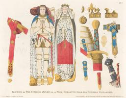 Plate II. 1. Portion of the Duke's coronet. 2. One of the metallic loops attaching the cordon of the mantle of the Garter to either shoulder. 3. Skirts of the corslet, hilt and guard of the sword, mountings of the scabbard, &c. 4. Portion of the Garter on the left knee, enlarged. 5. One of the straps attaching the tassets, 6. Hilt of the dagger, or misericorde, with lace attaching it to the hip. 7. The sword-belt. 8. Portion of the Duchess's coronet, enlarged. 9. Part of the metallic loop of the cordon of her mantle. 10. Pattern on the Ranches of her habit.