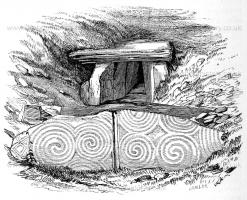 Llewellynn Jewitt 1870. One of the most important in size, as well as in general interest, is the one at New Grange [Map], county Meath. "The cairn, which even in its present ruinous condition measures about seventy feet in height, and is nearly three hundred feet in diameter, from a little distance presents the appearance of a grassy hill, partly wooded; but upon examination the coating of earth is found to be altogether superficial, and in several places the stones, of which the hill is entirely composed, are laid bare. A circle of enormous stones, of which eleven remain above ground1, originally encircled its base. The opening (of which an engraving is shown on fig. 44) was accidentally discovered about the year 1699, by labouring men employed in the removal of stones for the repair of a road. The gallery, of which it is the external entrance, extends in a direction nearly north and south, and communicates with a chamber, or cave, nearly in the centre of the mound. This gallery, which measures in length about fifty feet, is at its entrance from the exterior about four feet in height, in breadth at the top three feet two inches, and at the base three feet, five inches. These dimensions it retains, except in one or two places, where the stones appear to have been forced from their original position, for a distance of twenty-one feet from the external entrance. Thence towards the interior its sides gradually increase, and its height where it forms the chamber is eighteen feet. Enormous blocks of stone, apparently water-worn, and supposed to have been brought from the mouth of the Boyne, form the sides of the passage; and it is roofed with similar stones. The ground plan of the chamber is cruciform; the head and arms of the cross being formed by three recesses, one placed directly fronting the entrance, the others east and west, and each containing a basin of granite. The sides of these recesses are composed of immense blocks of stone, several of which bear a great variety of carvings2. In front of the entrance (fig. 44) will be seen one of these carved stones.