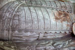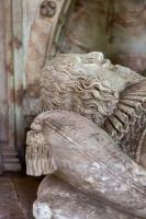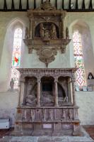 After 1656. St Edburga's Church, Leigh [Map]. Monument to Walter Devereux 5th Viscount Hereford (deceased) and [his former wife] Elizabeth Knightley Viscountess Hereford. Canopy suported on Ionic Capitals.