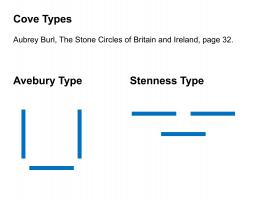 Cove describes a either a three-sided structure, the Avebury Type, formed from upright stones typically at the centre of a Stone Circles or the end of an Avenue, or the Stenness Type: three stones, inline, with the middle offset, as per the following diagram: