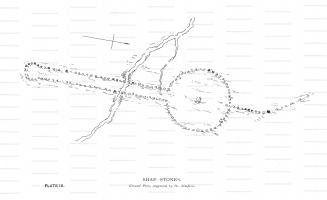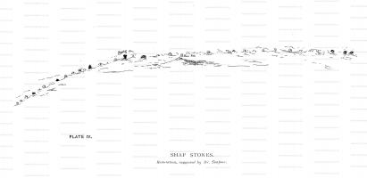 Cumbria and Westmorland Antiquarian and Archaeological Society. I propose to give you his results, with the aid of a map traced from the Ordnance Survey, (see Plate I). On that map is a farm house, called Brackenbyr, about 100 yards south of the railway station, and nearly opposite the Greyhound Inn, at Shap, which is on the east side of the high road, while the farm is on the west. Here Dr. Simpson thinks he could, in 1859, from tradition and from various indications, make out that there once was a stone circle, 400 feet in diameter, with a large stone in the centre. There is a legend of a huge stone which once stood here, and was cut up into seven pairs of "yat-stoops" (gate posts).1 From this circle at Brackenbyr, an avenue or double row of stones ran to the south and terminated in a stone circle, of which some five stones2, as well as three forming part of the avenue, are still to be seen on the west side of the L. and N. W. Railway, which, most unluckily, on its formation in 1844, passed over and destroyed the remains of the avenue, leaving only the eight stones just mentioned. The diameter of the circle was 30 yards3, and it is at a place called Shapsey, about half a mile to the south of Brackenbyr. With this paper is given, (Plate II) a reproduction of a drawing, made in 1775, by Lady Lowther, wife of Sir James Lowther, afterwards Earl of Lonsdale. This shows the avenue, and is taken from the Shapsey, or south end of it, looking north. Returning again to the Brackenbyr circle, Dr. Simpson makes out a single row of large stones (the huge pyramidal stones) running from that circle in a north-westerly direction, of which four stones remain at Karl Lofts4, about 200 yards north of the Greyhound Inn at Shap. Seven or eight others, including the Guggleby, are yet to be found, and tradition says they extended as far as Moor Divock. Dr. Simpson's restoration of the Shap Stones is reproduced here as Plate III, which gives a ground plan, while Plate IV gives his idea of the appearance presented by the single row of large stones (the huge pyramidal stones) running from the Brackenbyr circle in a north-westerly direction. We are inclined to think he shows far too many stones. Canon Greenwell appears to approve of Dr. Simpson's restoration: at any rate, he writes:—