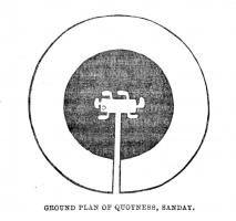Rambles in the Far North Chapter 11. At Quoyness, in Elsness, there is what appears to be a large brough [Quoyness Chambered Cairn [Map]] — a mound which was opened in the summer of 1867 by Mr. Farrer, M.P. At the present time its diameter is about 63 feet, and its height 12½ feet. Inside a building about 32 feet in diameter several cists were found. A passage about 12 feet long by 21 inches wide — of a nature similar to that at Maes-Howe — runs along from the south-east side of the mound. A number of decayed human skulls, which do not seem to have belonged to a very high type of man, were found here. In the course of the excavations many decayed bones were turned up. Four cists of a semi-circular shape were discovered within this brough — two of which contained skulls and a few human bones. The other two were empty. Three other cists of smaller dimensions and containing human remains were discovered. Some of the teeth found in them still preserved the enamel, and others bore evidenceto the fact that toothache must have made itself felt amongst that ancient people. In the midst of the rubbish a bone dagger, 7 inches long, a battle-axe of basalt, and a stone used for pounding corn, were found. One of the thigh bones measured 17½ inches long, and was fairly well preserved. It is not yet precisely ascertained whether this mound was originally a burial place or not. Some of the excavated bones were forwarded by Mr. Farrer to Dr. Thurnam of Devizes ; but that learned gentleman could only say they were of great antiquity — some male, some female, and some of children. Standing stones, Picts ' houses, and tumuli, are to be seen in almost every island of any size, and afford food for reflection to all who have a taste for such antiquarian relics.