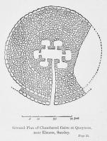 The Orkneys in Early Celtic Times. The cairn of Quoyness [Map], in Sanday, has been a large circular mound fully 60 feet in diameter, with an average height, even now, of nearly 10 feet ; while, from the accumulation of debris, it must have been much higher originally. The passage leading into the interior was about 24 feet in length, and led directly to an oblong shaped chamber, nearly rectangular, 124 feet in length, 5½ feet in width, with walls upwards of 12 feet in height. From this there were six passages leading to an equal number of irregularly-formed oval cells, two on each side, and one on each end of the central chamber. Fragments of upwards of twelve human skulls were found in these cells, of all ages; one or more had the appearance of having been cleft prior to being interred. With these fractured skulls were found some animal bones, supposed to be those of the ox. No pottery was found, but two stone implements of unknown use, and a third, made of bone, resembling an elongated borer, 7 inches in length.