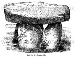 Archaeologia Cambrensis 1872 Pages 81-143. One ot the most perfect and interesting dolmens [Gwal y Filiast Burial Chamber [Map]] in Wales stands in the grounds of Dolwilym, in the northern extremity of the parish of Llanboidy, in Carmarthen-shire. The spot in which it is placed commands a singularly picturesque view of the vale and river of Taf, and is about midway down the steep slope on the right side of the river. Originally the chamber consisted of five or rather six stones, although only four now remain. The fifth, now missing, filled up the empty space at the south-west angle; and in all probability there was a second small stone at the eastern end, as the one now there could not, from its shortness, have closed that entrance. The western side is formed of one large stone on which the capstone rests; whence it is certain that the entrance was not here, but at the opposite end, towards which also the capstone gradually inclines. The upright stone at the eastern end is only about 2 ft. high; that at the opposite extremity being 4 ft. 4 ins.,—a difference that would not be expected from the almost horizontal position of the capstone. Sir Gardner Wilkinson gives the length and breadth, 11 ft. 6 ins. and 8 ft. 10 ins. Another measurement, taken diagonally, gave the two diagonals, 11 and 10 ft. There are several scattered stones lying about, all probablyconnected with the chamber and mound; of which last, however, hardly any traces remain. There are in all thirty-two stones within the circle; but the exact position, on account of the long and wet grass, was not ascertained with any accuracy of detail on the occasion of its being examined; but at any rate there are the remains of the circle of Isolated stones which constantly surrounded the base of the tumulus, at, some little distance from it. It has two names according to E. Davies, the author of the well known volumes on Celtic antiquities and Druids, one of Which is Burdd Arthur (Arthur's table), and the other, Gwâl y Vilast (the couch of the greyhound bitch). Of this animal there are many records scattered over Wales, Thus Ffynnon Milgi, in Llanelidan parish, in Denbighshire, is one instance. The inner sides of the upright stones are smooth and regular, while the lower face of the capstone, contrary to the more usual practice, is extremely rough and rugged. Near it is what is known as Crochan Arthur.