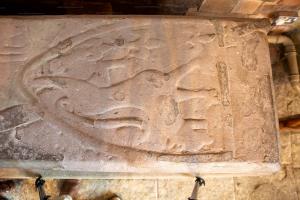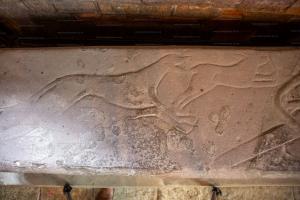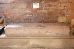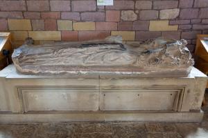 Around 1350. Slab. Found under a floor tile in the Chancel of St Asaph Cathedral [Map]. It bear a shield with a lion and fleur-de-lys, a sword passing diagonally beneath, and a hound chasing a hare.