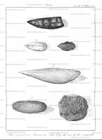 The smooth stone (f), PL XLIX. was found on the top of one of the urns. It differs only in shape from the common boulder stones, which, though usually met with in sandy grounds, are not to be found in the Peak on a lime-stone soil. It is therefore probable, that the superstitious Britons might have preferved these kind of stones as scarce and valuable amulets; and I am more inclined to be of that opinion from having, some years ago, met with two stones similar to this deposited with some others on Stanton-moor.