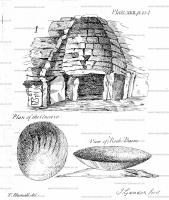 This gallery at the mouth is three feet wide, and two feet high. At thirteen feet from the mouth it is only two feet two inches wide at the bottom, and of an indeterminate width and height. Four of the side stones, beginning from the fifth on the right hand, or eastern fide, stand now leaning over to the opposite side; so that here the passage is scarce permeable. We made our way by creeping on our hands and knees till we came to this part. Here we were forced to turn upon our sides, and edge ourselves on with one elbow and one foot. After we had passed this strait, we were enabled to stand; and, by degrees, as we advanced farther, we could walk upright, as the height above us increased from fix to nine feet. At H in the section fig. 2. PI. XXI. I observed, that on one of the side stones, were the traces of a spiral line; but whether meant for any emblem, or, whether having any reference to this building, I leave to the curious to decide. Were I to indulge my own conjecture, I should rather suppose, that this stone, as well as some others in the compilation of this structure, had formerly belonged to some other monument of a much more ancient date, and that they were brought from the sea coast indiscriminately with the rest of the materials, and without knowledge of their contents, as well as without reference to the place they were here fixed in, being placed just as the shape of the stone suited the place assigned it. The distance from A to B in the ground plot PI. XXI. fig. 3. is 42 feet; from B to C is 19 feet 4 inches, from C to D 19 feet 2 inches; from E to F 21 feet. You will observe from the plan, that, although the cemetery is an irregular polygon, yet it is such an octagon as might be supposed to be formed with such rough materials into so rude a style of architecture. The dome of this cave or cemetery springs at various unequal heights, from eight to nine and ten feet, on different sides, forming at first a coving of eight sides. At the height of fifteen or sixteen feet the north and south sides of this coving run to a point like a gore, and the coving continues its spring with six sides; the east side coming to a point next, it is reduced to five sides, the west next; and the dome ends and closes with four sides; not tied with a key stone, but capped with a flat flag stone of three feet ten inches by three feet five. The construction of this dome is not formed by key stones, whose sides are the radii of a circle, or of an ellipsis converging to a center. It is combined with great long flat stones, each of the upper stones projecting a little beyond the end of that immediately beneath it; the part projecting, and weight supported by it, bearing so small a proportion to the weight which presses down the part supported, the greater the general weight is which is laid upon such a cove, the firmer it is compacted in all its parts. This will appear without any further explanation from a bare inspection of fig. 1. and 2. in PI. XXI.