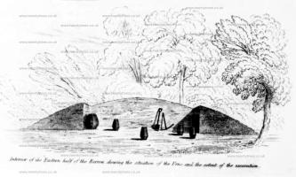 "Not a vestige of any weapon, bead, or other ornament could be discovered. The soil of which the barrow was formed was most excellent brick earth, which appeared perfectly well tempered and fit for immediate use, without further preparation, and contained not a single pebble larger than a bean, and not more than half a dozen of these were found after removing the first few inches of soil. Some of the urns, when uncovered, were found leaning to one side, and by the impressions made in the surrounding clay were evidently cracked on the day of their deposit. It is remarkable that nothing was discovered in the western half of the barrow.