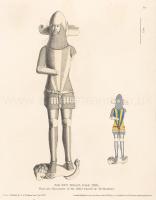 Although this subject suffers considerably in its appearance, from the mutilations it has undergone, yet, from the richness and peculiarities of the armour, it is a valuable specimen. It is executed in stone, and has been painted, gilt, and silvered, though there is but little of this now remaining. Sir Guy Bryan appears to have been represented in the act of drawing his sword, an action not common on monuments at so late a period: on his head is the basinet, the camail attached to it by a red lace; the surcoat is charged with the arms of Bryan, or, three piles meeting in base azure, the field is diapered with a white raised composition; the piles are painted with ultramarine, and have been beautifully diapered with white, the only remains of which are to be traced under the right arm. The arms are covered by the mail sleeves of the haubergeon, the lower part only from the elbow defended with plate: on the upper, upon the mail, are singular appearances—a number of iron pegs placed in regular order, enclosing a space, in form and extent the same on both arms; for what purpose they were placed there, it is not easy to conjecture. The sword and dagger are broken away, as are also the gauntlets. The mail chausses covering the legs seldom appear after plate-armour had been so long introduced, and they have here singular additions, being strengthened with narrow plates above and below the genouillieres, each plate having, distributed equidistant along its sides, six pegs of wood, the purpose of these, or why they were of an extraneous substance, is as unaccountable as what we find on the arms. The whole of the armour, plate and mail, has been once covered with silver leaf. The mailles of the camail, haubergeon, and chausses, are of different sizes, and formed with a white impressed composition, as on the surcoat. The crest upon the helmet under the head is too much mutilated to determine what it is, but most resembles a griffin's head. We should have expected a bugle-horn for the crest. Sir William Bryan, son of Sir Guy, bearing this on his brass in Seale Church, Kent. The architectural part of the monument is extremely light and elegant, and it has on that account severely suffered; for many of the shafts, which supported this delicate fabric, are lost, and a great number of those that remain are out of their perpendiculars in all directions. As far as there were authorities remaining, a restoration has been made in the etching, which represents the monument nearly in its original state. The arms on the base are in the centre, and on each side. The wife of Sir Guy Bryan, being Elizabeth, daughter of William de Montacute, Earl of Salisbury.