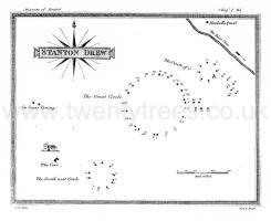 95. Stanton Drew lies in Somersetshire, about seven miles from Bristol on the south, and on the further side of Dundry-hill. It's name sufficiently shews, that it was the Stone-town of the Druids. It contains three circles of stones, (beside some other stones contiguous to them), which are commonly called the Wedding, and a silly story is told, that the whole company were suddenly turned into stones: here stood the bride and bridegroom, here the fiddler, here a set of dancers The largest and the smallest circles are both situate in a field, called Stone-Close, adjoining to the dwelling house of Mr. Coates. The annexed plan represents the whole structure under the following rule: if the stone projects largely above the ground, it is represented by a black mark: if merely visible or tangible, by an outline: if quite under-ground, and only suspicious, by dots. The whole plan is made with great care, and is (as I believe) the first accurate one ever published. I have added two plates, giving a view of some of the most remarkable stones: the lithographic manner, in which they are represented, suits well with the rude appearance of the originals. The great circle according to my measurement is 342 feet diameter: Mr. Wood makes it 378, and Dr. Stukeley 300: the outward circle of stones at Stonehenge has only about 100 feet diameter, and that of Abury 1215 feet at the mean. The measurements in the Gent' Mag' are not worth attention. In the great circle at Stanton Drew only five stones are actually standing in their places; so that the first appearance is not particularly striking. How many there were originally it is impossible to ascertain, for the distances of those which remain are very irregular, and must have been so from the beginning, if the fallen stones still lie where they fell, which is probably the case. I have set down 27 in the plan, which (as I think) may be depended on; there were more without doubt: Dr. Musgrave, who wrote in 1718, supposes that there were once 32; probably there were many more. They were not perfect in his time: it is said in the village, that about 100 years ago, great depredations were made on them, and many were broken for the purpose of mending the road Dr. Stukeley says that about ten years before his time (he visited it in 1723) they suffered great dilapidation; until which time, he says, they were perfect. The greater part of them are magnesian limestone: but some are red sandstone, and some breccia.