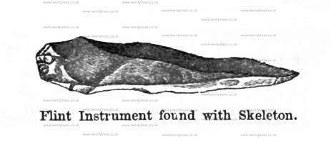 In 1821, an extensive excavation, 150 feet in length, was made by Sir R. C. Hoare, along the whole length of the mound, to the west of the trilith. On this occasion, what was probably the original principal interment was disclosed, about 60 feet from the east end of the barrow, and about 30 to the west of the cromlech. Here, on the natural soil, a slight cist had been scooped out, and furnished with a rudely constructed pavement of unworked thin stone. Over this, a sort of rude arch, of the same kind of stone appeared to have been raised, which however had fallen in. In the cist, was an entire human skeleton, laid on the right side, having the head to the west, and the face to the south. It was in a contracted position, with the knees drawn up, the right hand on the upper part of the chest, and the left arm laid across the body. Under the left hand, and not far from the head, was a small instrument of flint about an inch and a half in length, brought to a very sharp point, and apparently formed for piercing or cutting. "Tt was," says Sir R. C. Hoare, "too thin for an arrow-head, but might have served for a lancet.1
