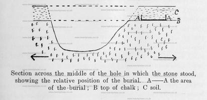 A discovery that has an important bearing on the date of the erection of the stone, and therefore presumably on the date of the monument of Avebury as a whole, was made in removing the soil in front of the hole preparatory to clearing it out. The discovery was that of the remains of a human skeleton and fragments of a "drinking cup," or " beaker," close to and immediately in front of the hole in which the stone had stood. The section here given shows how very near the burial must have been to the side of the stone when standing; this section, drawn through the centre of the hole, at right angles to its length, cuts as nearly as it was possible to ascertain, through the middle of the burial, showing that it was placed in the centre of this face of the stone. Presuming that the three stones of the cove originally formed a sort of triangular enclosure this face of the stone would have been the inner one.