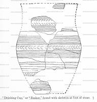 The "drinking cup," of which fragments were found with the bones, was a well-made and well-decorated example of its type, namely, the "ovoid cup with recurved rim," and must have stood not less than 8in. in height. The ware is thin, and baked to a bright red both inside and out, showing the grey paste in the middle; the paste is fine and sparingly mixed with sand. The vessel was decorated from lim to base with a series of horizontal lines, alternating with rows of herring-bone pattern, and bands of the plain tooled surface. The horizontal lines, and the lines forming the herring-bone pattern, have the appearance of having been impressed by a notched or serrated tool, as is so often the case on this type of vessel.