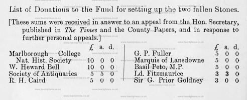 The society is greatly indebted to Mr. George Brown, of Beckhampton, on whose land the stone stands, for his permission to raise it, and for the kindness and forbearance with which he accepted the inconvenience attendant on the operation. The length of time that the work was about, the trampling of visitors and others through the hedge and the serious interruption to the farming of the land, made no slight call on his patience and good nature. The Society are also grateful to Mr. Brown for his intention not to disturb or cultivate the ground immediately round the stone in the future.