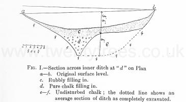 There can however, be no: doubt that the earthwork was designed primarily for defence. It is, on the other hand quite clear from the character of the inner ditch as revealed by excavation, apart from its indefensible position, that this ditch was never intended for defence. Excavation at five different points showed it to be of quite different character from the outer one. It was very irregularly cut, with a wide flat bottom, whereas the outer ditch was well cut and almost V-shaped. Humps or promontories of unexcavated chalk were left in the inner ditch, sometimes on one side, sometimes on the other, forming occasionally what were tantamount to bridges across it. By means of these irregularities it must always have been easy to get in or out of the ditch almost anywhere on either side. Moreover, for a length of 60ft. (d on plan) the ditch had never been completely dug out. We believe, as suggested by Hoare (An. Wilts, 1., p. 218), that the ditch was simply a quarry from which the material came to strengthen the rampart. By thus quarrying at an equi-distance all round the rampart, instead of at one spot, the distance over which the material had to be carried was reduced to a minimum.