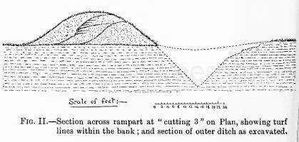 Three cuttings were made through the rampart in each of which two old turf lines were found, representing, it is believed, additions at two different times.