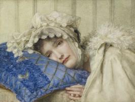 1902 Anna Alma-Tadema (age 34). "Girl in a Bonnet with her Head on a Blue Pillow".