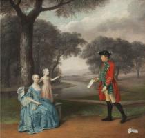 1752. Arthur Devis (age 39). Portrait of Joshua Vanneck 1st Baronet (age 50) and Family. Sitters believed to be left to right: Joshua Vanneck 1st Baronet, Mrs. de la Mont (likely his sister), Henry Uthoff (Anna Maria's husband), Gerard (age 8) (son), Gertrude (daughter, with telescope), Joshua (age 6) (son, on ground), Margaret (age 9) (youngest daughter, on ground), Anna Mara (age 18), Elizabeth (age 20) (eldest daughter), and Thomas Walpole (age 24) (Elizabeth's husband and cousin of Horace Walpole (age 34)).