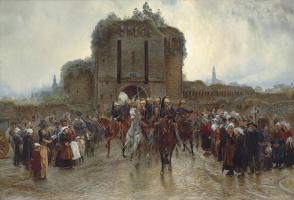 1888-1889. Elizabeth Thompson Lady Butler (age 41). "To the front: French cavalry leaving a Breton city on the declaration of war".