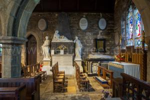 Her tomb consists of a large block of white marble on a black slab on which her finely carved effigy rests showing her in a winding sheet. The black slab is supported by black pillars with white capitals and base.