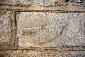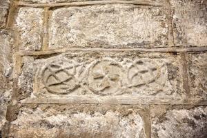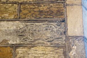 680. Saxon stonework incorporated in to the later building of All Saints Church, Ledsham [Map]. Butcher's cleaver; possibly Romam altar stone.