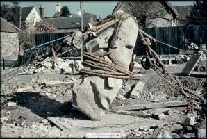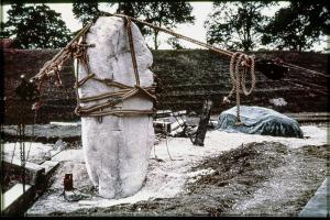 Keiller's Slides TR000083. 1938. General view of the re-erection of stone 6 [Map] in the south west sector of the henge at Avebury, showing the use of pullys.