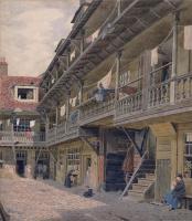 1869. "Book of Days". The other galleried inn of Warwick-lane is the Oxford Arms [Map], within a recess on the west side, and nearly adjoining to the residentiary houses of St Paul's in Amen-corner. It is one of the best specimens of the old London inns remaining in the metropolis. As you advance you observe a red brick pedimented facade of the time of Charles II, beneath which you enter the inn-yard, which has, on three of its sides, two stories of balustraded wooden galleries, with exterior staircases leading to the chambers on each floor: the fourth side being occupied by stabling, built against part of old London Wall.