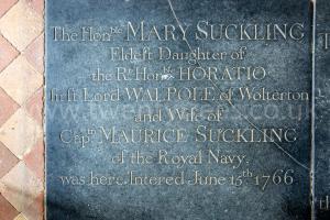 Mary Walpole: On 25th February 1725 she was born to Horatio Walpole 1st Baron Walpole and Mary Magdalen Lombard. On 20th June 1764 Captain Maurice Suckling and she were married. She died twenty months later. There was no issue from the marriage.