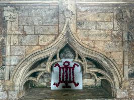 The North Transept of the Church of St Lawrence, Whitwell [Map] with the "Monkey Window". The border glass included seated figures of apes holding urine flasks, probably early 14th Century. Apes were kept as pets by the wealthy. In medieval symbolism apes represented fraud and indecortum, and were used by carvers and glass painters to satirise.