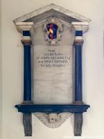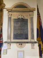 Probably by Peter Scheemakers (age 62), erected by Thomas Strode, brother of George, with reclining figures of a man and woman on a sarcophagus and on either side standing allegorical figures one with a cornucopia the other an anchor, above is an achievement-of-arms.