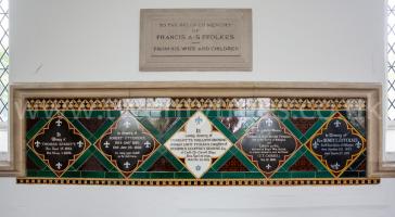 After October 1938. Church of St Mary, Hillington [Map]. Monument to Francis Arthur Stanley ffolkes 5th Baronet (age 74), Charlotte Philippa Browne and Reverend Henry Edward Browne ffolkes.