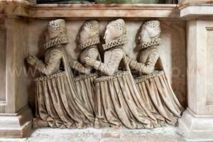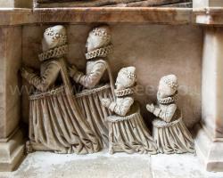 After 31st October 1612. Church of St Peter and St Paul, Easton Maudit [Map]. Monument to Christopher Yelverton (deceased) and Margaret Catesby was buried at Church of St Peter and St Paul, Easton Maudit [Map]. Early canopied Stuart Hooded Monument with eight daughters shown on one side, four sons on the other. The posts support a canopy of two semicircular arches with coffered soffits, urn ornaments at the angles, and shields of arms.
