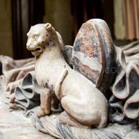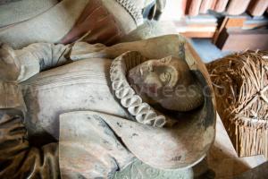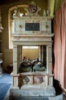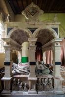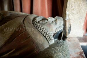 Elaborate canopied Stuart Hooded Monument of alabaster, the effigies one above the other, with the figures of four sons and five daughters below. The canopy is supported by bedesmen in black gowns, and is surmounted by figures of Faith, Hope, and Charity. Above is an inscribed panel surrounded by books on end and various linked symbols with winged cherubs above. Large caryatids representing hooded bedesmen to left and right. Arch above with 3 standing figures and 2 hour-glasses on sculls.