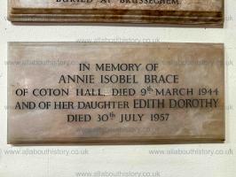 St Werburgh's Church, Hanbury [Map]. In memory of Annie Isobel Brace of Coton Hall, Staffordshire [Map], died 30th July 1957.