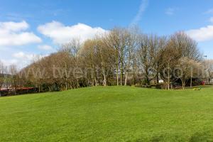On the south-west side of the henge, c.20m distant, is a large mound interpreted as an oval barrow overlain on its western end by a later bowl barrow. It is sub-rectangular in shape and measures 27m by 21m by c.2.5m high. Originally it would have been somewhat higher but has been disturbed on the summit by a World War II slit trench. Its current plan is due to modern disturbance round its edges, caused by ploughing and the construction and later removal of drystone walls on its east and north sides. No recorded excavation of the barrow has been carried out so it cannot be precisely dated.