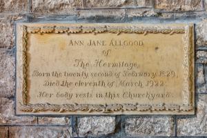 After 1922. St Mungo's Church, Simonburn [Map]. Memorial to Ann Jane Allgood (age 92).