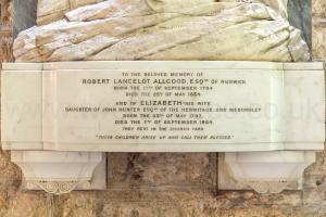 1868. St Mungo's Church, Simonburn [Map]. Memorial to Robert Lancelot Allgood and his wife Elizabeth Hunter. Sculpted by Matthew Noble (age 50).