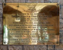 After 1880. St Mungo's Church, Simonburn [Map]. Memorial to Thomas Ridley of Park End (age 62) and his sisters Eliza, Jane Margaret, Susan Catherine, and brother Matthew Atkinson Ridley.