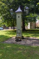 The Water Pump in the South Bailey, Durham. A Grade II Listed Building. Late C18/early C19. Stone base; wood boarded column enclosing pump with iron handle and bucket stand. Tall square column; long curved handle on north side; C19 square gas lamp on wrought iron bracket attached to east side over water pipe and bucket stand. Moulded square stone base.