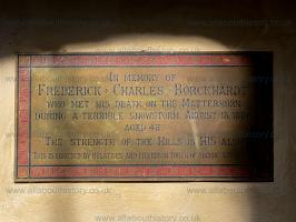 St Albans Cathedral [Map]. Memorial to Frederick Charles Borckhardt who met his death on the Matterhorn during a terrible snowstorm on the 18th August 1886 aged 48.