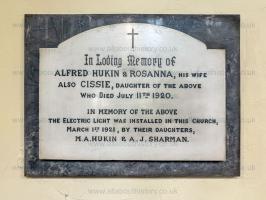 Memorial at St Michael and All Angels Church, Brimington [Map] to Alfred and Rosanna Hukin, and Cissie their daughter, and in whose memory Electric Light was installed in the church.